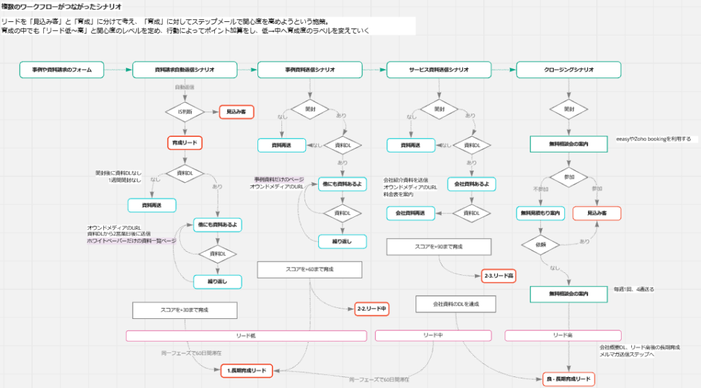 お問い合わせフォームから、顧客管理システムへデータが入り、どのように管理し、どのようにメールマーケティングを行うかを上図のような設計図を作り、クライアントの現場運用に適した形にしていきます。